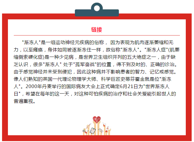 世界上有这样一个群体:他们的身体像被冰雪冻住,今天是腿,明天是手,后连控制眼球转动的肌肉也不例外;从出现症状起,五年死亡率约90%……他们是“渐冻人”。今天,世界渐冻人日,关爱渐冻人,蜀中金盖克在行动,用爱解冻,让生命不再无力!